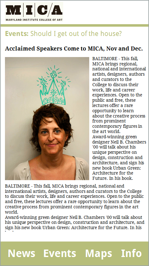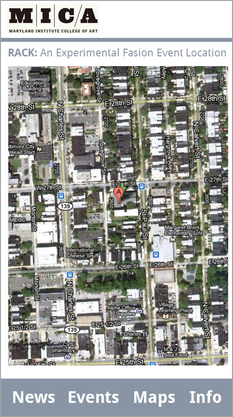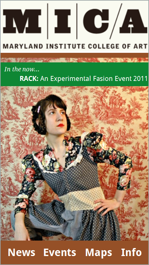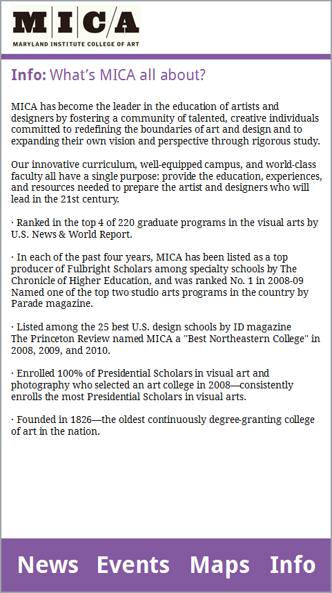 This mobile application was created for the Maryland College of Art to allow students to get information about events and information around the college campus. It includes events pages, event mapping, campus news articles, and highlights of places around campus. This application was developed for Android and iPhone.